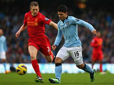 Manchester City’s Sergio Aguero scored from a near-impossible angle to salvage a 2-2 home draw with Liverpool but a memorable goal from Steven Gerrard still helped boost Premier League leaders Manchester United on Sunday. The irony of one of Liverpool’s most battling displays of the season helping arch-rivals United end the weekend nine points clear following Saturday’s 1-0 win at Fulham will not be lost of either set of fans but their draw was fully deserved. Second-placed City have dropped points twice in a week following a 0-0 draw at bottom side Queens Park Rangers and only the most avid fan will think the champions can overhaul United now despite last season’s stunning fightback. “Liverpool played a good game but we conceded two goals, stupid goals for me,” City boss Roberto Mancini told Sky. With 13 matches remaining, United also have a better goal difference by three but it would have been even worse for City had Argentina striker Aguero not produced a moment of magic in an engaging game 12 minutes from time. Edin Dzeko had given City the lead midway through the first half and slightly against the run of play when he slotted in James Milner’s low cross from close range. The visitors were unlucky to be behind after Daniel Sturridge had been denied by a last-ditch tackle from Pablo Zabaleta among other Liverpool chances but the former City frontman made it 1-1 after 29 minutes with a fine finish. He fired in a crisp strike from 25 metres among boos from the home fans with Dzeko lying on the ground following an earlier incident. However the referee rightly ruled it was not a head injury and play was not stopped. [caption id=“attachment_612269” align=“alignleft” width=“380”]
