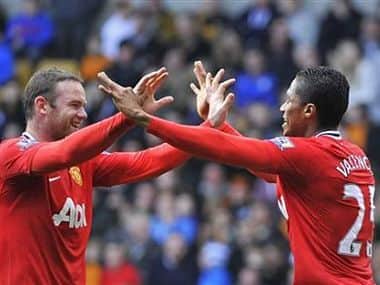 London: Manchester United ruthlessly ripped apart 10-man Wolverhampton Wanderers to stroll to a 5-0 victory on Sunday and move four points clear at the top of the Premier League. The champions scored early through defender Jonny Evans and the floodgates opened following the sending-off of Wolves defender Ronald Zubar before halftime. Right winger Antonio Valencia netted the second and made the third for Danny Welbeck before the interval and Mexican Javier Hernandez struck twice to complete an emphatic victory. United, knocked out of the Europa League on Thursday, went four points clear of Manchester City who play their game in hand on their local rivals against Chelsea on Wednesday. Wolves slipped to the bottom of the table on goal difference. [caption id=“attachment_248497” align=“alignleft” width=“380” caption=“Manchester United’s Valencia celebrates scoring with teammate Rooney against Wolverhampton Wanderers during their English Premier League soccer match at Molyneux in Wolverhampton in central England. Reuters”]  [/caption] “We’ve lost two of our last three games here and we looked at it as a tough match,” United manager Alex Ferguson told Sky Sports. “The performance wasn’t great, it was adequate, and the scoreline makes it looks like it was comprehensive but our finishing was good. “The number of goals was very important and it could be significant by the end of season. We’ve got the goal difference deficit with Manchester City down by five to three and we hope we can catch them up.” Evans tapped in from close range following a corner after 21 minutes and Zubar was booked for a reckless lunge on Rooney, only to make a similar challenge on Welbeck soon afterwards and earn his second yellow card. Valencia, returning to the side after injury, sprinted clear down the right before clipping the ball sweetly into the far corner and the Ecuadorean set up Welbeck for a crisp low shot into the net. United looked determined to improve their goal difference and the unmarked Hernandez headed in Rafael’s teasing cross before arriving late to lash home his second following more good work by Valencia. United manager Alex Ferguson made three substitutions but his team continued to dominate possession against their dispirited opponents who conceded five goals for the third time in five games and face a desperate battle for survival under caretaker manager Terry Connor. Newcastle United host Norwich City later on Sunday. Reuters