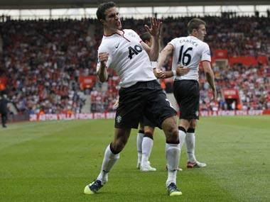 London: Robin van Persie made up for an embarrassing failure from the penalty spot by grabbing a hat trick with two late goals in Manchester United’s dramatic 3-2 win at Southampton on Sunday, earning the English giants a second straight win in the Premier League. In a fitting way to mark United manager Alex Ferguson’s 1,000th league game in charge, Van Persie equalised in the 87th minute before heading home a corner in the second minute of injury time for his fourth goal since joining from Arsenal for 24 million pounds ($38 million) in the offseason. Arsenal showed earlier there is life after Van Persie when new signings Lukas Podolski and Santi Cazorla scored their first goals for the club in a 2-0 win over struggling Liverpool. The loss leaves Liverpool rooted in the bottom three after the club’s worst start to a season in 50 years, compounding its woes after a failure to add some much-needed signings to the squad on Friday’s transfer deadline day. In the day’s other match, Aston Villa earned its first point of the campaign with a 1-1 draw at Aston Villa, only being denied victory because of Hatem Ben Arfa’s stunning second-half equalizer. Van Persie’s late show, which took him to 100 Premier League goals in 197 games, will have come as a mighty relief for the Netherlands striker, after his impudent chipped penalty was clawed away by goalkeeper Kelvin Davis in the 68th minute. The score was 2-1 to Southampton at the time and United looked headed for a second loss in three games before Van Persie’s last-gasp intervention. [caption id=“attachment_440712” align=“alignleft” width=“380”]  Van Persie celebrates after scoring his third goal. AP[/caption] “I don’t know what I was thinking with the penalty. I was going to hit it hard but at the last second I changed my mind,” Van Persie said. “I’m quite disappointed about it. I ask certain standards from my game and at 2-1 down you cannot take a penalty like that.” Ferguson, famous for what the British media calls the “hairdryer treatment” in the dressing room when his team or player underperforms, was all smiles after the match despite Van Persie’s error of judgment. “I was surprised because every time I’ve seen him take a penalty he usually rattles it into the corners, so I was confident,” Ferguson said. “But he made up for it.” Having started the season with a 1-0 loss at Everton, this win lifted United up to fifth place on six points, one behind neighbor and reigning champion Manchester City and three behind early leader Chelsea. Arsenal is in eighth place, a point further back than United. United’s defense looked shaky throughout at St. Mary’s Stadium, with both of promoted Southampton’s goals stemming from crosses to the back post where United’s full backs were outwitted. Rickie Lambert put the hosts in front in the 16th, beating Rafael da Silva in the air and heading home a trademark finish. Van Persie equalised when he chested down a cross from Antonio Valencia and volleyed into the corner. But Southampton regained the lead in the 56th through Morgan Schneiderlin, beating a slipping Patrice Evra to a cross and planting a header into the corner. “We have to take positives from our performance,” said Southampton manager Nigel Adkins, whose side is the only one in the Premier League without a point. “We are scoring goals and what we have to do is stop conceding them at the other end.” The game changed when Ferguson sent on Paul Scholes in the 61st, with Southampton suddenly backing off and allowing the veteran midfielder to control play. The Liverpool-Arsenal match was already being seen as a must-win game for both teams, and it was the visitors who sealed their first win and goals of the season with an encouraging display at Anfield. Arsenal won 2-0. Podolski, the Germany forward, and Cazorla, the Spain midfielder, set each other up for their goals, while fit-again midfielder Abou Diaby was the standout player on the pitch and Arsenal also kept a third straight clean sheet. “The sharpness gets better from game to game and we looked solid and scored two good goals,” Arsenal manager Wenger said. “‘‘Everybody understood quickly Cazorla would not need six months to settle. Lukas Podolski is deadly when he gets a chance. I am pleased for them.” Liverpool lacked a cutting edge up front, and failing to sign a striker this week after loaning out Andy Carroll to West Ham could come back to haunt manager Brendan Rodgers. “I am not here to cry,” Rodgers said. “I felt we needed reinforcements — that is the reality. But it is gone now. The window is shut.” Ciaran Clark put Villa ahead at St. James’ Park before Ben Arfa equalised with a rising drive from 20 yards (meters), rescuing Newcastle after a poor home performance. AP