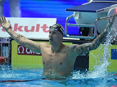 Gwangju: American Caeleb Dressel retained his world men’s 100 metres freestyle crown Thursday, collecting his third gold medal of the week. The 22-year-old, who swept to seven world titles two years ago, clocked a blistering 46.96 seconds in Gwangju to win swimming’s blue riband event in the second fastest time ever, with Olympic champion Kyle Chalmers taking silver. [caption id=“attachment_7056961” align=“alignleft” width=“380”] USA’s Caeleb Dressel celebrates winning the final of the men’s 100m freestyle event. AFP[/caption] Dressel high-fived Australian rival Chalmers before perching himself on the lane rope as he milked the applause, raising a fist to flag-waving American fans. Chalmers touched in 47.08 with Russia’s Vladislav Grinev the best of the rest in 47.82. Rio gold medallist Chalmers came into the world championships on fire, but Dressel exploded from the blocks and was half a body length in front at the turn. Chalmers tried to fight back but Dressel had too much of a lead and the tattooed pin-up romped home to claim his fourth medal of the week.