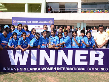 Ranchi: Medium-pacer Deepti Sharma grabbed six wickets before Veda Krishnamurthy scored a half-century as Indian women posted a comfortable seven-wicket win over Sri Lanka in the third and final ODI on Friday to complete a 3-0 clean sweep. Deepti followed up her four-for in the previous game with figures of 6-20 to bundle out Sri Lanka for a meagre 112 in 38.2 overs. India then crossed the target in just 29.3 overs with Veda Krishnamurthy top-scoring with an unbeaten 61. [caption id=“attachment_2634250” align=“alignleft” width=“380”] The victorious Indian women’s team in Ranchi on Friday. BCCI[/caption] Sri Lanka got off to a good start after electing to bat, with openers Yasoda Mendis (14) and Prasadani Weerakkody (19) adding 33 before Deepti took two wickets in two consecutive deliveries to trigger a dramatic collapse. Although captain Shashikala Siriwardene (14) and Dilani Manodara (23) later combined for a 32-run sixth-wicket stand, wickets kept falling and Sri Lanka were ultimately bowled out for 112 from 94 for five at one stage. Debutant Preeti Bose also put up an impressive show, returning figures of 8-4-8-2. India’s chase started in a shaky fashion as the home team lost both openers Poonam Raut and Smriti Mandhana cheaply. While Poonam was dismissed for a duck in the very first over, Mandhana was run-out soon after for six. Veda and Deepti (28) then consolidated the innings with the duo adding 70 in 109 balls to take India closer to the target. India then cruised to the target with 123 balls to spare. Krishnamurthy remained not out on 61 off 90 balls that was studded eight fours. PTI