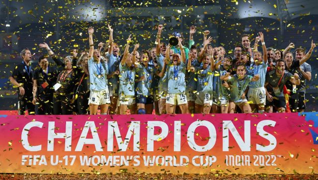 Navi Mumbai: Defending champions Spain won the FIFA U-17 Women’s World Cup with a 1-0 victory over first-time finalists Colombia whose campaign ended in a heartbreak after an own goal in the summit clash in Navi Mumbai on Sunday. Spain emerged the winners after an own goal by Colombian defender Ana María Guzmán Zapata in the 82nd minute of the final at the DY Patil Sports Stadium. FIFA president Gianni Infantino, alongside top officials from the Asian Football Federation (AFC) and All India Football Federation (AIFF), were in attendance at the venue as Spain eked out a solitary goal win and retained the title they also claimed in 2018. Spain took the lead with Cristina’s goal, when she scored off the rebound after the Colombian goalkeeper had stopped it the first time. However, the score remained 0-0 as the goal was disallowed by a VAR review. It ruled that Cristina had touched the ball with her hand. The two teams also met in the group phase, with Spain winning 1-0. This was European giants Spain’s second title. In the third-place classification match, Nigeria beat Germany 3-2 on penalties. Two missed penalties by Germany’s Paulina Platner and Loreen Bender and a save by goalkeeper Omilana Faith off Paulina Bartz’s shot paved the way for Nigeria’s first-ever medal in the tournament. Hosts India failed to clear the group stage after losing all their three matches. Read all the Latest News , Trending News , Cricket News , Bollywood News , India News and Entertainment News here. Follow us on Facebook , Twitter and Instagram .
