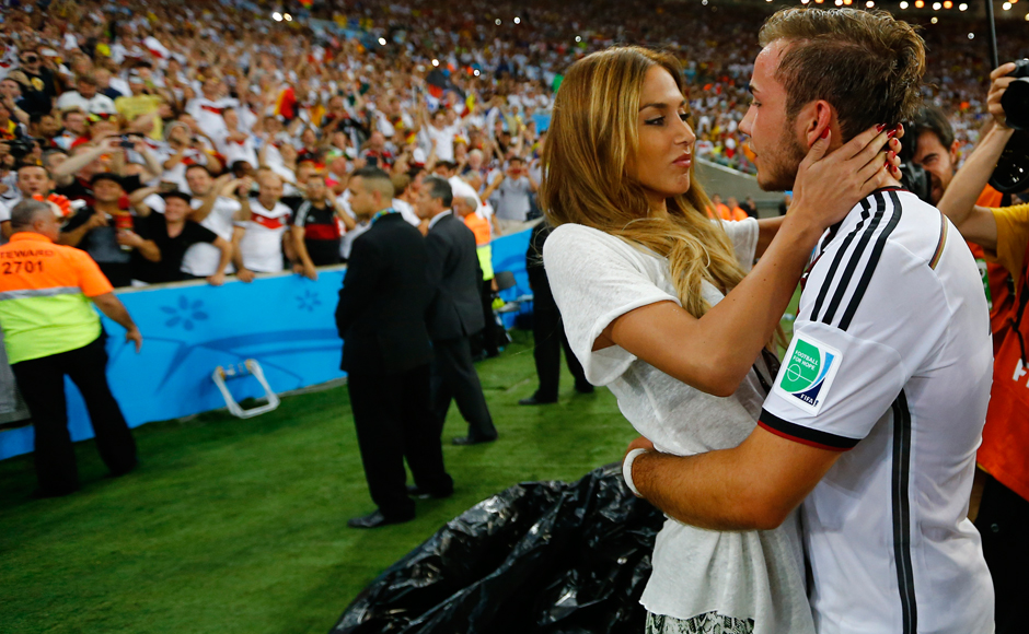Germany edged Argentina 1-0 to win their fourth World Cup title. Just as the final whistle went, the Maracana erupted. There were wild celebrations from the players and the fans. The German players were accompanied by their loved ones and after the match they quietly celebrated with family and friends at the ground. Here are some lovely pictures. German hero and ‘miracle boy’ Mario Goetze hugs his girlfriend Ann-Kathrin Brommel celebrating the title win. Reuters