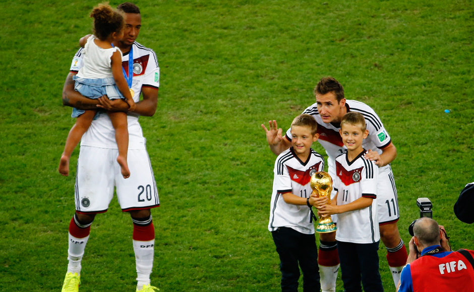 Jerome Boateng (L) and Miroslav Klose pose with children holding the World Cup trophy after their 2014 World Cup final win against Argentina at the Maracana stadium. Reuters