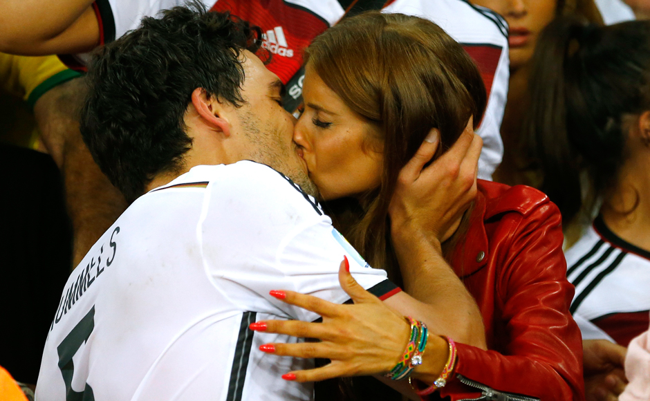 German defender Mats Hummels kisses his girlfriend Cathy Fischer after the match. Reuters