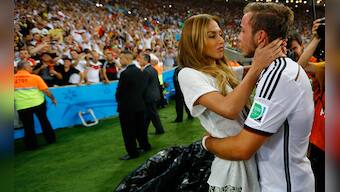 Germany edged Argentina 1-0 to win their fourth World Cup title. Just as the final whistle went, the Maracana erupted. There were wild celebrations from the players and the fans. The German players were accompanied by their loved ones and after the match they quietly celebrated with family and friends at the ground. Here are some lovely pictures. German hero and 'miracle boy' Mario Goetze hugs his girlfriend Ann-Kathrin Brommel celebrating the title win. Reuters