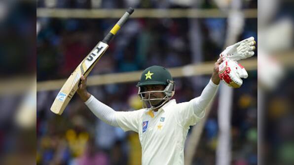 Mohammad Hafeez hit a career-best 224 as Pakistan took charge of the first Test against Bangladesh with an impressive batting marathon during the third day’s play in Khulna on Thursday. The tourists batted the entire day to move from their overnight score of 227 for one to 537 for five by stumps, a lead of 205 runs over Bangladesh’s first innings total of 332. [caption id=“attachment_2221232” align=“alignleft” width=“380”]  Hafeez celebrates after scoring a double century (200 runs) during the third day. AFP[/caption] Hafeez, who started the day on 137, surpassed his previous best of 197, made in Pakistan’s previous Test against New Zealand in Sharjah last November. The 34-year-old all-rounder hit 23 boundaries and three sixes before being dismissed just before tea, gloving a sweep off Shuvagata Hom to Mohammad Mahmudullah at leg-slip. Hafeez, who had fallen in the 190s on two previous occasions, moved to 198 with a fluent straight-driven four off seamer Mohammad Shahid and then reached his double century with a sweep off Taijul Islam for two runs. The dominant batting display, in which Pakistan’s top seven batsmen were all involved in partnerships of above 50, left the tourists two days to force a win and take the lead in the short two-Test series. Azhar Ali carried his overnight score of 65 to 83 when he was bowled by off-spinner Shuvagata to end a 227-run partnership for the second wicket with Hafeez. That was Bangladesh’s only success in the morning session as veteran Younis Khan joined hands with Hafeez to add 62 for the third wicket before he was bowled by Taijul for 33. Skipper Misbah-ul Haq put on 63 for the fourth wicket with Hafeez and 66 for the fifth with Asad Shafiq, himself scoring 59 with the help of four boundaries and two sixes. Misbah also fell to left-arm spinner Taijul, top-edging a sweep to backward square-leg where Rubel Hossain took the catch. At stumps, Shafiq and Sarfraz Ahmed were both unbeaten on 51, having put on 69 for the unbroken sixth wicket. Bangladesh took the field without captain and wicket-keeper Mushfiqur Rahim, who had injured a finger while attempting to take a catch on the second day. Imrul Kayes kept wickets and the captaincy was handed to Tamim Iqbal, whose review for a leg-before appeal when Hafeez was on 173 was turned down by both the on-field and TV umpires. Bangladesh used eight bowlers on the slow pitch at the Sheikh Abu Naser stadium, the most expensive being star all-rounder Shakib Al Hasan, whose 31 wicketless overs of left-arm spin cost 122 runs. Taijul picked up three wickets and Shuvagata claimed the other two. The second and final Test will start at the Sher-e-Bangla stadium in Dhaka on May 6. AFP