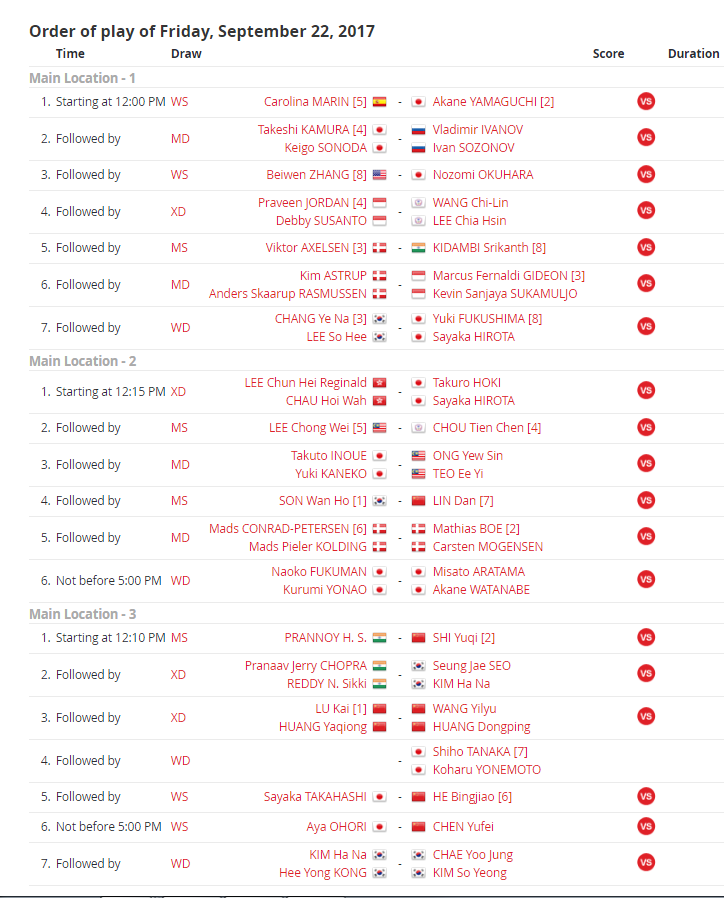 PV Sindhu, Nozomin Okuhara, Saina Nehwal and Carolina Marin. AFP[/caption] Olympic medallists Sindhu and Okuhara share four wins apiece in career meetings and have recently developed an enthralling rivalry. While Okuhara got the better of Sindhu at the World Championships final in August in Glasgow, the Hyderabadi hit back at the Korea Open in Seoul last weekend. Another intriguing duel on Thursday will be between London Olympic bronze medallist Saina Nehwal and 2016 Olympic champion Carolina Marin of Spain. Saina leads the head-to-head record against the Spaniard by 4-3. Saina on Wednesday moved past Thai Pornpawee Chochuwong 21-17, 21-9 in 40 minutes, while two-time world champion Marin breezed past Chinese Chen Xiaoxin 21-11, 21-11. Eighth-seed Srikanth fought off China’s Tian Houwei 21-15, 12-21, 21-11 in an hour and four minutes. After this win, Srikanth, India’s best bet in the men’s singles category, will take on Chinese Hu Yun. Prannoy got the better of Denmark’s Anders Antonsen 21-12, 21-14 in 37 minutes. The Indian will face Chinese Taipei’s Hsu Jen Hao for a place in the quarter-finals. Sameer Verma also moved into the second round as he registered a 21-12 21-19 victory over Thailand’s Khosit Phetpradab. Sameer will meet Shi Yuqi of Japan on Thursday. B. Sai Praneeth and Sourabh Verma, however, had to face defeats in the opening round. While Sourabh lost to five-time world champion Lin Dan of China 21-11, 15-21, 13-21, Praneeth went down 23-21, 17-21, 14-21 to South Korean Lee Dong Keun. Meanwhile, young Satwik had a mixed day as he lost in the men’s doubles and advanced in the mixed doubles. Satwik-Ashwini pair staved off Thailand’s Tinn Isriyanet and Pacharapun Chochuwong with a 21-17, 21-13 victory. The unseeded Indians will face a huge task of defeating Indonesian fourth seeds Praveen Jordan and Debby Susanto on Thursday. Satwik then partnered Chirag Shetty to lose to Indonesian third seed Marcus Fernaldi Gideon and Kevin Sanjaya Sukamuljo 25-27, 15-21 in 38 minutes. Ashwini too lost in her doubles category. She and N Sikki Reddy ran into South Korean third seeds Chang Ye Na and Lee So Hee and the latter prevailed 21-17, 21-12 in 39 minutes. The senior Indian pair of Manu Attri and B. Sumeeth Reddy also fell in the first round. The Indians lost to Chinese Taipei’s eighth seeds Lee Jhe-Huei and Lee Yang 18-21, 15-21 in 31 minutes. With inputs from IANS