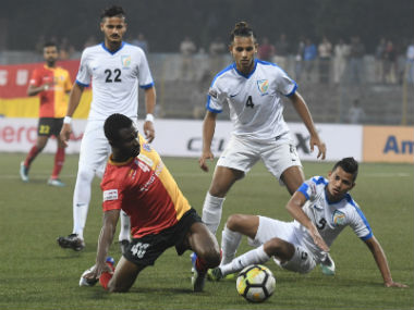 Barasat: An injury minute strike by Dudu Omagbemi helped East Bengal revive their title bid with a narrow 1-0 win over Indian Arrows in a I-League football match on Sunday. [caption id=“attachment_4335329” align=“alignleft” width=“380”]  Indian Arrows in action against East Bengal in their I-League match. I-League[/caption] Winless from four matches, East Bengal had virtually given up on their title hope, squandering at least half a dozen chances but the veteran Nigerian’s 90+3rd minute header gave them a fresh lease of life in a nail-biting finish. With five matches remaining, East Bengal (23 points) jumped past arch-rivals Mohun Bagan (20) to reclaim the third spot, four points shy of leaders NEROCA FC (27). It was heartbreak for Indian youngsters as they put up a stellar defence, only to fall short in the dying minutes as East Bengal managed to keep pace in the title race with the injury time winner. East Bengal, who won by a 2-0 margin in the first leg in New Delhi, will next face second-placed Minerva Punjab in an crucial away fixture on 13 February. Nothing was going in favour of the Khalid Jamil’s wards, who were denied by the woodwork in the first half while the developmental side of the All India Football Federation gave them scare more than a few occasions with their spirited attack. Just when the crowd were about to return home dejected, substitute Mohammed Rafique set it up with a long ball as Dudu rose to the occasion for a vital finish. Arrows goalkeeper Prabhsukhan Gill was out of the line and it was just the perfect opportunity for Dudu to find the back of the net with a looping header. Until then it was hits and misses for both the teams. Arrows forward Abhijit Sarkar had a golden opportunity to seize the initiative when he found himself in a one-on-one position with CK Ubaid but he hit the ball straight at the East Bengal custodian. Katsumi Yusa has been the livewire for East Bengal but they were unlucky in the first-half. Arrows survived a scare in the 34th minute when Dudu hit the woodwork from a tight angle. Yusa was in his elements in creating opportunities and even scored from an off-side position but he never found the right coordination with Dudu. Dudu struck a powerful header in the 28th minute but Gill stood in the way as goals continued to elude East Bengal till the Nigerian finally got into the act before it was all over. The developmental outfit of the AIFF made a flurry of attacks in the closing stage of the first half but they kept missing the target as the stalemate continued. In what appeared their best chance of the match, Sanjeev Stalin set it up with a brilliant cross but Rahul KP headed it out with East Bengal custodian Ubaid coming out of his line.
