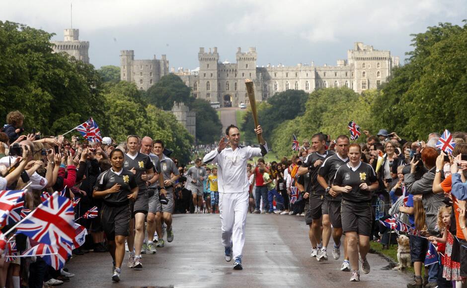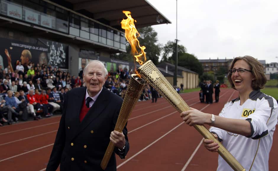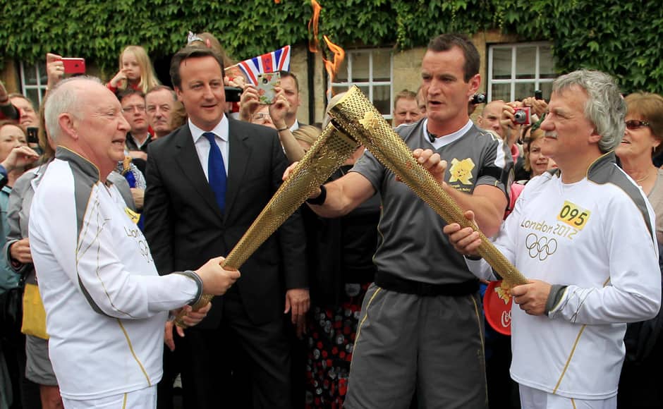 [caption id=“attachment_373800” align=“alignleft” width=“940”]  Queen Elizabeth II, second right, and the Duke of Edinburgh watching the Torch Kiss as Torchbearer 073 Gina Macgregor, right, passes the Olympic Flame to Torchbearer 074 Phillip Wells, left, outside Windsor Castle, Windsor, England Tuesday July 10, 2012. AP[/caption] [caption id=“attachment_373799” align=“alignleft” width=“940”]  Torchbearer 077 Alan Corbishley carrying the Olympic Flame on the Torch Relay leg down Long Walk after leaving Windsor Castle. AP[/caption] [caption id=“attachment_373802” align=“alignleft” width=“940”]  Formula One driver and torchbearer 001 Lewis Hamilton holding the Olympic Flame before his Torch Relay leg through Luton, England Monday July 9, 2012. AP[/caption] [caption id=“attachment_373803” align=“alignleft” width=“940”]  Britain’s Prime Minister David Cameron watching the Olympic Flame pass between his nominated Torchbearer 094 Clive Stone MBE, left, and Torchbearer 095 Roland Read in Woodstock, England, Monday July 9, 2012. AP[/caption] [caption id=“attachment_373806” align=“alignleft” width=“940”] ") The Olympic Flame is passed between Sir Roger Bannister and Oxford doctoral student Nicola Byrom on the running track at Iffley Road Stadium in Oxford, England, Tuesday July 10, 2012. AP[/caption]