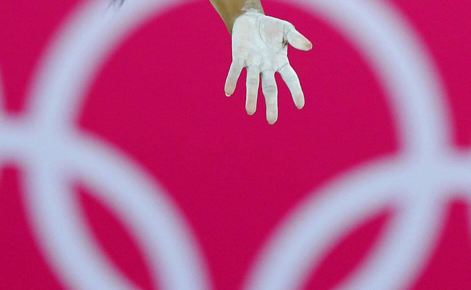 Talk to the hand: The hand of Daiane dos Santos of Brazil is seen during a gymnastics training session at the O2 Arena. Reuters[/caption]