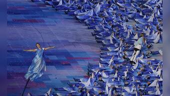 Performers race suspended in mid-air during the Opening Ceremony. AP