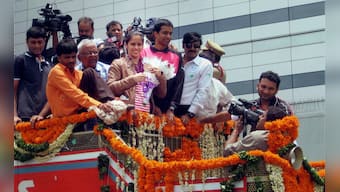 Olympic bronze medallist Saina Nehwal arrives at the Rajiv Gandhi International Airport Shamshabad near Hyderabad on Tuesday. PTI