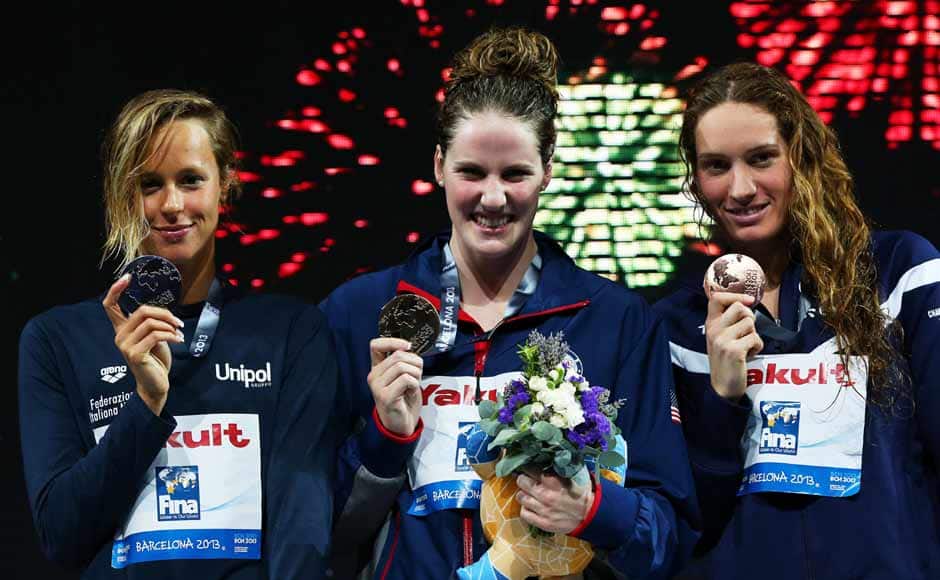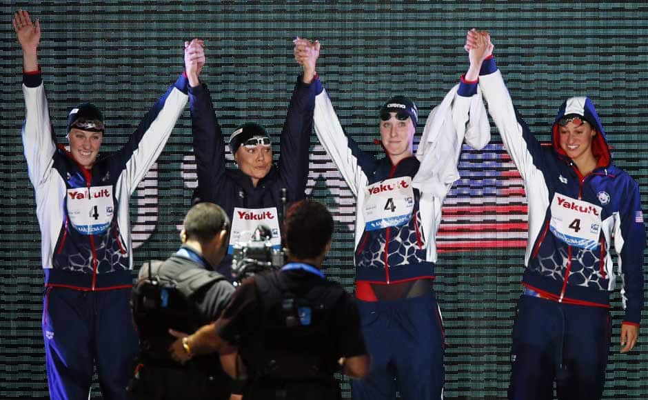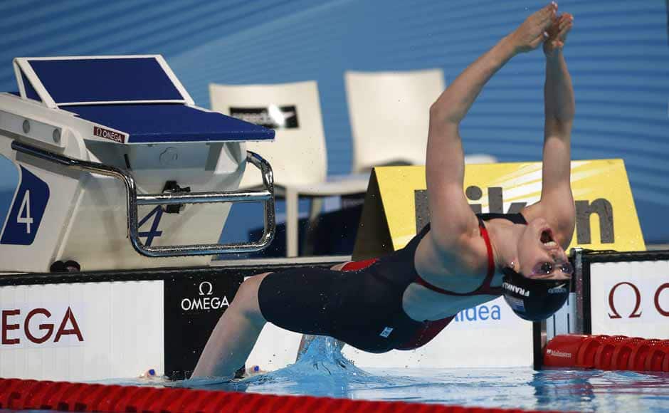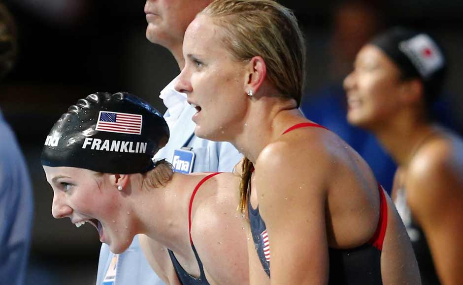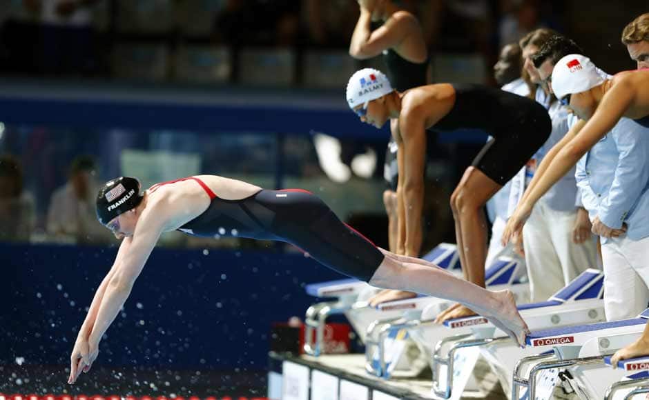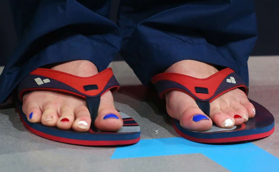 [caption id=“attachment_1010077” align=“alignleft” width=“940”]  Missy Frankling en route to a gold medal in the 200m backstroke, where she recorded a time of 2:04.76. This is also a new championship record. Getty Images[/caption] [caption id=“attachment_1010081” align=“alignleft” width=“940”]  Before the 200m, Franklin also reigned supreme in the 100m backstroke, winning with a time of 58.42 — six-tenths of a second ahead of Emily Seebohm of Australia. Reuters[/caption] [caption id=“attachment_1010087” align=“alignleft” width=“940”]  The 200m freestyle gold followed, where she won with a time of 1:54.81. Getty Images[/caption] [caption id=“attachment_1010099” align=“alignleft” width=“940”]  Along with teammates Katie Ledecky, Shannon Vreeland, and Karlee Bispo, Franklin won gold in the 4x200-meter freestyle relay. Swimming the anchor leg and diving in with a deficit of over a second, Franklin was able to track down Australian Alicia Coutts, recording a split of 1:54.27 and the team finishing with a time of 7:45.14. Reuters[/caption] [caption id=“attachment_1010107” align=“alignleft” width=“940”]  Teammates Natalie Coughlin and Shannon Vreeland made up some ground and anchor Megan Romano overtook the Australian team in the last 20 meters to give the Americans the gold medal. Franklin (far left), of course, was also part of the team. Reuters[/caption] [caption id=“attachment_1010113” align=“alignleft” width=“940”]  Franklin cheers her teammates on during the 4x100m medley, where she won her sixth gold. Reuters[/caption] [caption id=“attachment_1010119” align=“alignleft” width=“940”]  A detailed shot of Missy Franklin’s painted toenails. Not only is she fast, she’s cool too. And like all great swimmers, she has big feet – size 13 to be exact. Getty Images[/caption]