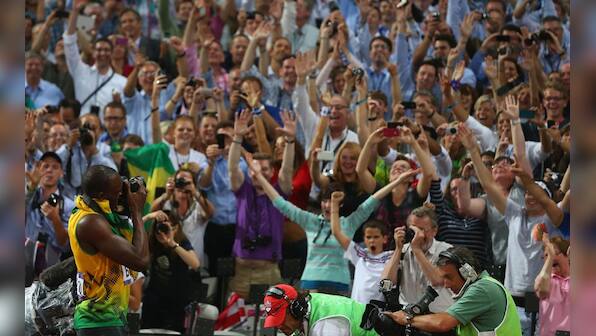 Usain Bolt takes photographs of the crowd with one of the photographers’ cameras as he celebrates winning gold in the Men’s 200m Final. Alexander Hassenstein/Getty Images