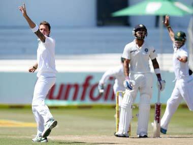 Day five report: South Africa 58 for no loss (Petersen 31*, Smith 27*) and 500 all out (Kallis 115, de Villiers 74, Petersen 62, Jadeja 6-138) beat India 223 (Rahane 96*, Pujara 32, Peterson 4-74) and 334 (Vijay 97, Pujara 70, Steyn 6-100) by 10 wickets. Tasked with getting 58 to win the Durban Test and take the series, Graeme Smith and Alviro Petersen did not muck about, getting to their target in just 11.4 overs to give Jacques Kallis a victorious send off from Test cricket. [caption id=“attachment_1314647” align=“alignleft” width=“380”]  Graeme Smith celebrates after striking the winning boundary. AFP[/caption] Smith finished the match in pugnacious style, slapping Rohit Sharma’s part-time offspin back over the bowler’s head for six and then cutting the next ball to the point boundary to win by 10 wickets. Smith raised both arms above his head in celebration before the players shook hands and walked off the field. It was a disappointing finish to the series for India, who matched South Africa for the majority of the two Tests, and should really have won in Johannesburg. Dale Steyn’s fierce spell on day two was the biggest difference between the two sides, while Dhoni’s defensive tactics on day four raised eyebrows and essentially eliminated any chance India had of competing for a win in this game. Despite the loss, there is much India can take from the series. Cheteshwar Pujara and Virat Kohli showed they can make runs in tough conditions; Ajinkya Rahane proved he is ready for Test cricket; Murali Vijay displayed a resolve not many thought he had and Ravindra Jadeja turned out to be a viable spinning option overseas. The seam bowling remains a worry though, as aside from the first innings of the first Test, India found wickets hard to come by. That is something the selectors, the coach and the captain will have to figure out fast with India playing most their cricket away from home in 2014. Day five innings report: India 223 (Rahane 96*, Pujara 32, Peterson 4-74) and 334 (Vijay 97, Pujara 70, Steyn 6-100) lead South Africa 500 all out (Kallis 115, de Villiers 74, Petersen 62, Jadeja 6-138) by 57 runs. South Africa need 58 runs to wrap up the two-Test series in Durban but Ajinkya Rahane left his stamp on the final day’s proceedings with a courageous 96 that showed there were few demons in the Kingsmead pitch. Despite the precarious nature of India’s situation and the quality of the opposition bowlers, Rahane exuded an aura of calm concentration. He was neither cowed nor jumpy, content to trust his technique and his judgement and, as the cliché goes, play each ball on its merits. In extending India’s innings for an hour after lunch with just the tailenders for company, he also showed what could have been had one of India’s middle-order batsmen attempted to stick it out alongside him. Zaheer Khan belied his reputation and refused to slog, despite Graeme Smith giving Robin Peterson an extended spell. He batted for over an hour and faced 41 balls to make just 3, before he was wrongly give out lbw to a carom ball from Peterson that replays showed would have missed legstump comfortably. It was the second decision of the day that DRS would have overturned except there is no DRS because the BCCI does not want it. Rahane was on 81 when Ishant received a brute of a bouncer from Steyn that he could only fend off towards leg slip, where AB de Villiers took a simple catch. It was Steyn’s 350th Test wicket in his 69th Test, making the second-fastest to get to that mark (tied with Richard Hadlee; Murali Muralitharan needed 66 Tests). The loss of Ishant brought out the T20 version of Rahane, who had already hit Peterson straight down the ground for six to move into the 70s. He straight drove Philander back over his head to get to 90, then slapped him over cover for an astounding six. With three figures just one blow away, Rahane tried to slog Philander through the leg side but lost his leg bail instead. It was disappointing end to his innings, but it was still every bit as good as the ones from Cheteshwar Pujara and Virat Kohli earlier in this series and it was good to see Smith come up and pat Rahane on the back as the players walked off the field. The visitors’ hopes of saving the second Test Durban all but evaporated with the first ball of the day. Dale Steyn steamed in at Virat Kohli, who tentatively prodded at a delivery that pitched just short of a good length. In actual fact, the ball missed the edge and brushed Kohli’s shoulder on the way through to the keeper. But the noise was enough to make the umpire raise his finger. Kohli stood still in shock and disbelief but he had no one to blame but his own board, which resolutely opposes the use of the Decision Review System. Had India been able to review the decision, Kohli would have batted on and India might well have been in a very different position. Instead, a fired-up Steyn proceede to produce the ball of the match to Pujara. It swung in at speed, pitched on a good length, then seamed away to defeat even Pujara’s rock-solid defense and hit the top of offstump. Pujara was clearly stunned as he tried to work out just how bat had missed ball. India were stunned too, having lost their two best batsmen for a total of three runs and with them all hope of saving the game. Rohit Sharma, who has had a wretched series, started positively. He hit Robin Peterson for a massive six and even hooked Steyn away for four but then chose to exchange a few words with South Africa’s premier fast bowler. He was out shortly after when Vernon Philander gone one to come back off the pitch and trap Rohit in front of middle and leg. Rohit ended the series with 45 runs from four innings. Steyn made 44 in the first innings in Durban. In hindsight, Rohit would have been better off keeping quiet. Ajinkya Rahane continued to show that he has the stuff for Test cricket, carving out a n controlled half-century under considerable pressrue,