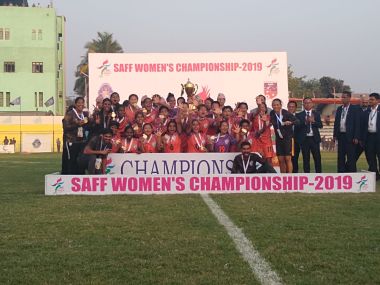 Biratnagar: India continued their dominance at the SAFF Women’s Championship by lifting their fifth straight title with a 3-1 victory over hosts Nepal in the final on Friday. With this win, India have extended their unbeaten run in the tournament’s history to 23 games. [caption id=“attachment_6310791” align=“alignleft” width=“380”] India beat Nepal in the final to clinch their fifth straight SAFF Women’s Championship title. AIFF[/caption] India scored through Dalima Chhibber, Grace Dangmei and substitute Anju Tamang at the Sahid Rangashala Stadium. Both the sides were seen pressing hard from the first whistle. Dangmei fashioned a couple of early chances down the right wing for India, while Nepal registered a couple of shots from distance with Manjali Kumar testing Indian custodian Aditi Chauhan in the 14th minute. Just three minutes into the game, after some excellent build-up play down the right, Sandhiya laid off a ball for Sanju to shoot from the top of the box. The winger’s effort was a powerful one but it was saved by the opposition keeper. On the other end, Sabitra Bhandari posed a threat for India inside the penalty area but her curling effort was off target. In the semi-final against Bangladesh, it was Chhibber who opened the scoring for India and this time around too, it was the right-back who gave India the advantage. In the 26th minute, she smashed the ball past the keeper from a free-kick from 30 yards with a powerful drive and put the defending champions into a 1-0 lead. Ratanbala Devi could have added a second goal six minutes later but her shot from distance was saved by the Nepal goalie. In the 34th minute though, Sabitra equalised for the hosts as she rose high above her marker and headed the ball into the back of the Indian net. The break saw both sides locked at a goal apiece. The second half began with India creating the majority of the opportunities, with Sanju and Ratanbala putting their respective efforts just over the bar. India’s pressure paid off in the 63rd minute as Sanju put Grace through on goal with a delightful through ball. The winger swiftly broke through, showed great composure and slotted the ball home to restore India’s advantage. India continued to keep Nepal at bay. Coach Maymol Rocky brought on Anju Tamang in place of Sandhiya midway through the second half at the top of the pitch and in the 78th minute, the move paid rich dividends as she slammed the ball on the volley for India’s third goal after a crafty first-time assist from Indumathi Kathiresan. Towards the end, Nepal tried hard to break the rival defence but the Indians refused to bow down and stood firm.