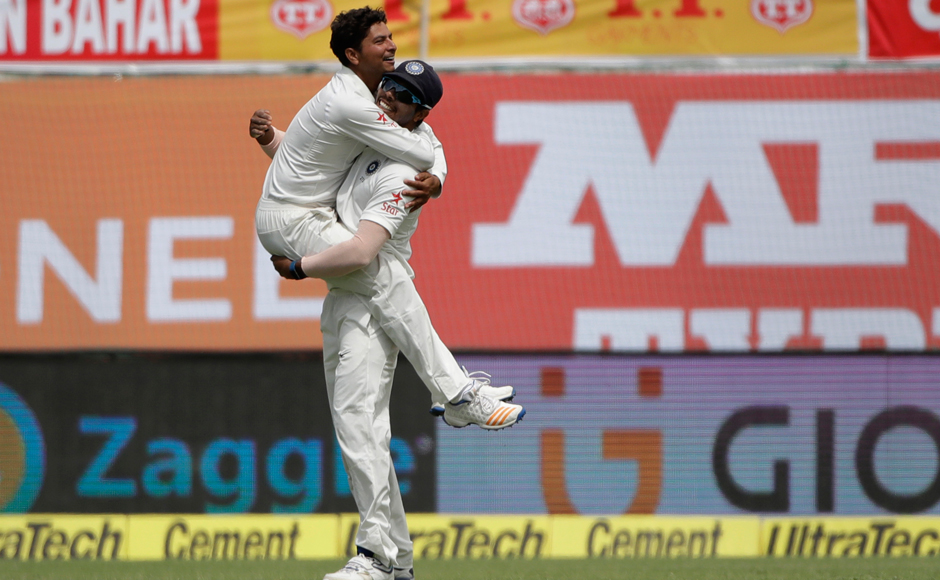 India’s Kuldeep Yadav is hugged by Umesh Yadav as they celebrate the dismissal of Australia’s Glenn Maxwell during the first day of their fourth test cricket match in Dharamsala. AP