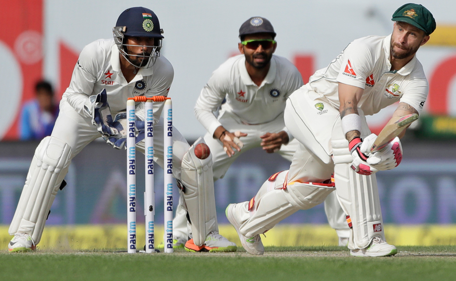 Australia’s wicket-keeper batsman Matthew Wade plays a superb shot during the first day of their final Test against India in Dharamsala. AP