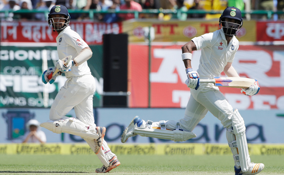 India’s Lokesh Rahul and Cheteshwar Pujara run between the wickets during the second day of their fourth Test against Australia in Dharmsala. AP
