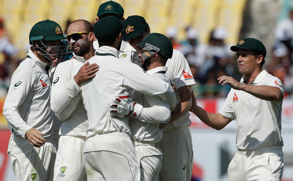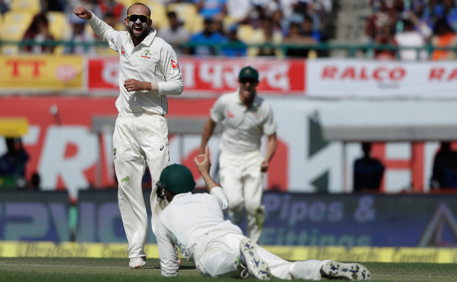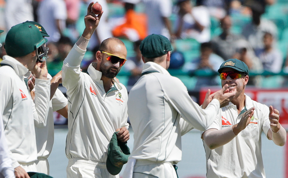 Australia’s spinner Nathan Lyon and his teammates celebrate as Karun Nair walked back to the pavilion cheaply during the second day of the final Test. AP