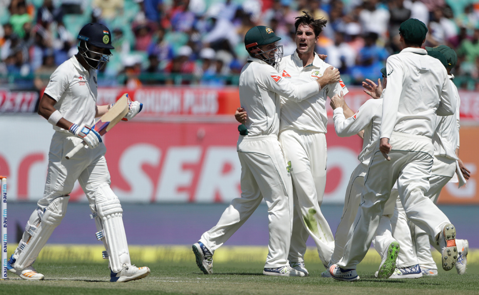 Pacer Pat Cummins was pumped-up as he celebrates with teammates after getting the best out of India’s Lokesh Rahul during the second day of their fourth test cricket match in Dharamsala. AP