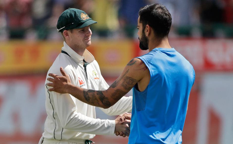 Australia’s captain Steven Smith and India’s captain Virat Kohli shake hands after India won the fourth Test and the Border-Gavaskar Trophy against Australia in Dharmsala. AP