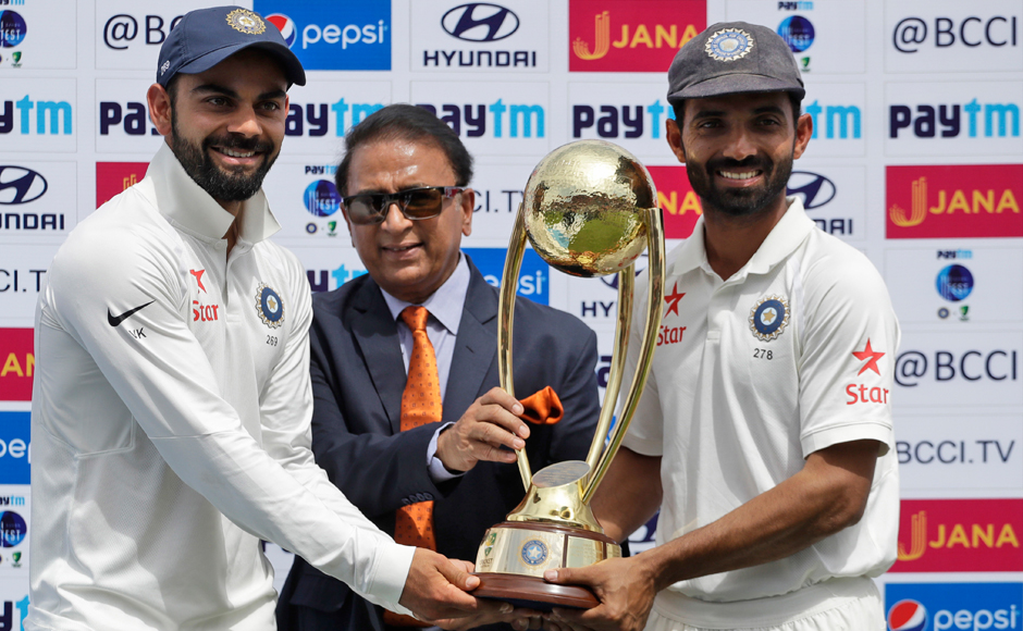 What a proud moment! Virat Kohli, Ajinkya Rahane and Sunil Gavaskar pose with the Border-Gavaskar Trophy after winning the much-anticipated series against Australia in Dharmsala. AP