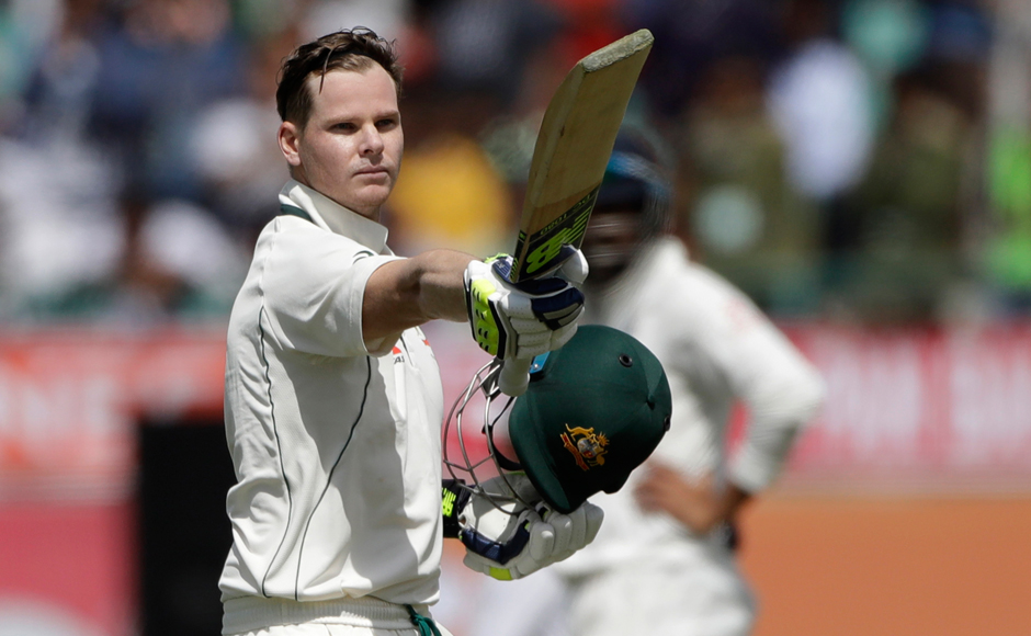 Australia started their first innings brilliantly as skipper Steve Smith raises his bat and celebrates his third century on the first day of the fourth Test. AP