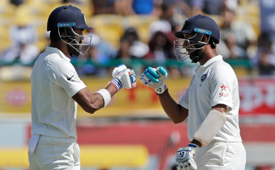 KL Rahul and Cheteshwar Pujara cheer each other after maintaining a good partnership in the first innings of the second day against Australia in Dharmsala. AP