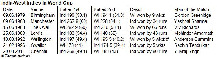 Mohammed Shami. BCCI[/caption] Interestingly, India have enjoyed an upper hand over West Indies in their World Cup campaigns – winning four games out of seven games so far. It was India under Kapil Dev that ended the Caribbean stranglehold on the Cup in 1983. In 2011, India faced West Indies in a World Cup match for the first time in 15 years. Indian skipper Dhoni won the toss and chose to bat first against the Darren Sammy-led West Indies. India suffered the first setback when they lost Sachin Tendulkar for two runs. But they manage to salvage the match after a century from Yuvraj Singh (113) and then youngster Virat Kohli (59) helped India post a challenging 268 on board. Zaheer Khan’s three wicket haul coupled with Yuvraj and R Ashwin’s shared four between them, helped India win by a solid 80-run margin. Tomorrow’s match is sure to be another cracker.