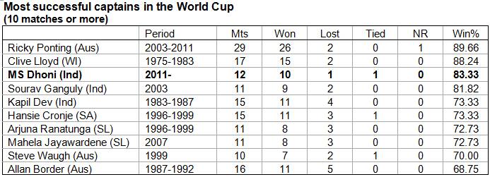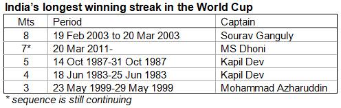 No one seems to have noticed it, but it is quite remarkable that MS Dhoni has captained India in two World Cups and has lost only one match so far. The sole defeat came against South Africa at Nagpur in last edition. One more win and Dhoni will equal Kapil Dev’s Indian record of most wins in World Cup.