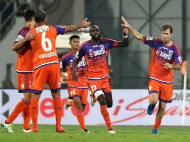 FC Pune City players celebrating a goal in their 4-3 win over Delhi Dynamos. ISL[/caption] This was Delhi’s second defeat this season and today’s loss ended their five-match unbeaten streak. The victory took Pune to the fourth spot from earlier sixth with 15 points from 11 matches, just two less than Delhi who could have virtually sealed their place in the play-offs with three points today. Chennaiyin FC and Atletico de Kolkata, both out of the top four now, can move on top with victories, while NorthEast United FC (11 points) and FC Goa (11 points) are still in the competition with three matches left to be played. In an exciting contest, Delhi goalkeeper Soren Porei was the hero for his team in the first 45 minutes after stopping a penalty from Mohammed Sissoko and blocking Momar Ndoye twice in a one-on-one situation. Pune had better control and should have at least taken the lead when Anibal was brought down inside the danger zone and the referee awarded a penalty. But marquee player Sissoko ended up with a poor penalty which Porei saved by guessing correctly and diving to his left. The miss proved costly for Pune as they conceded a goal close to half time. Marcelinho’s back-heel from just outside the box released Emerson Gomes de Moura whose pass inside the box gave Kean Lewis the space and time to slot it into the net in the 44th minute. The goal was the 400th in the ISL and gave Delhi confidence that they can qualify for the semi-finals with three matches in hand but Pune struck in the 55th minute. A free kick from Jonatan Lucca found Anibal who rose high over two defenders and headed it into the far post. Seven minutes later, Pune were ahead when Sissoko made amends for his poor penalty and slotted home from inside the box from another free kick. Pune appeared to have wrapped up the game only a minute later as Anibal capitalised on a blunder from Delhi Dynamos. Goalkeeper Porei threw the ball away to Ruben Gonzalez who could not control it. Anibal picked it up and beat the goalkeeper at the near post with a lightning strike. Florent Malouda had a hand in the second goal for Delhi as his shot across the goal hit defender Eduardo and sailed into the goal in the 79th minute. Any chance of a comeback was, however, snuffed out by Pune midfielder Lenny Rodrigues when he finished a pass from Lucca in the last minute of play. Malsawmzuala did manage to pull another goal back for Delhi in added time but there was no more time for the equaliser.