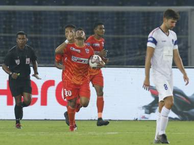 New Delhi: Miguel Angel Portugal’s Pune City managed to earn a hard-fought 1-1 draw at the death against home side Delhi Dynamos in their Hero Indian Super League opener on Wednesday. Delhi seemed set for all three points after a wonderful long-range strike from Rana Gharami (44th minute) only for second-half substitute Diego Carlos to level the scores with two minutes left on the clock. [caption id=“attachment_5312541” align=“alignleft” width=“380”] Diego Carlos celebrates scoring the equaliser for FC Pune City. ISL[/caption] Rana Gharami became the first Indian footballer to score a goal in the ISL 2018-19 season. Coach Josep Gombau had Delhi Dynamos line up in a 4-2-3-1 formation with Andrija Kaludjerovic leading the lines. Former Pune City midfielder Marcos Tebar started in midfield with Bikramjit Singh while Nandhakumar and Lallianzuala Chhangte provided the width. Pune City, playing a 4-3-3 formation, started brightly, with Ashique Kuruniyan finding a lot of space down the left flank. An early cross from the youngster almost found Emiliano Alfaro inside the box. Just after a quarter of an hour, Delhi started to assert themselves and fashioned several key chances. With a minute to go for the half-time whistle, Delhi Dynamos got a deserved lead through an outrageous strike from Rana Gharami. The defender got on the ball from about 40 yards out and hit a thunderous strike that flew into the top corner, much to everyone’s wonder. The second half got off to a slow start as both teams failed to create chances of note. Emiliano Alfaro cut a lone figure up front for Pune City while Delhi Dynamos pressed well but could not trouble the Stallions’ defence. The Dynamos continued to exploit the wings and should have doubled their lead in the 67th minute. Nandhakumar went on a brilliant run down the right wings and squared the ball for Kaludjerovic who met it with a weak left-foot that saw the effort trickle well wide. Portugal threw on Diego Carlos as he searched for an equaliser while Gombau sent on Romeo Fernandes for Nandhakumar. It was the latter who would fashion a chance as he galloped down the right wing and almost found Kaludjerovic inside the box, but for an alert Mills. The Stallions did get a chance though as a hopeful cross from the left fell to Jonathan Vila on the edge of the area. The Spaniard’s fierce volley drew a fantastic reaction save from Francisco Dorronsoro. With Pune turning desperate for a goal, Delhi had two good chances to score a second. First, Gianni Zuiverloon failed to direct a volley at the back post from Das’ freekick on target. Then a smart interplay between Kaludjerovic and Chhangte set the latter through on goal but he shot straight at Vishal Kaith. With two minutes left in the tie, Pune City equalised after brilliant link-up play between Alfaro and Carlos. The Brazilian played in Alfaro inside the box. The Uruguayan passed it back on to Carlos’ path who shifted on to his left and sent an arrowing finish to the far corner. Though Delhi pressed hard to regain their lead, Portugal’s men held on to clinch a point from a tightly-contested clash.