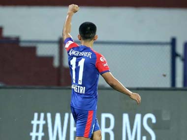 Bengaluru: Talismanic captain Sunil Chhetri scored the winning goal as Bengaluru FC beat Kerala Blasters 1-0 in an action-packed Indian Super League match at the Sree Kanteerava stadium on Saturday. Though Kerala Blasters battled valiantly, Chhetri scored the winner with a brilliant header in the 55th minute to preserve his side’s unbeaten record in the ISL. The win saw the Blues climb up to second on the table with nine points from five games while Kerala Blasters, winless after the opening match, are at seventh. The away side showed plenty of intent right from the start, pressing Bengaluru hard and forcing mistakes from the reigning champions. The first chance did fall for Kerala Blasters when Sergio Cidoncha picked out Rahul KP at the far post with a lovely cross. However, the youngster mistimed his header and the chance went abegging. An energetic Kerala Blasters continued to dictate terms and should have taken the lead six minutes later. Bartholomew Ogbeche fed Raphael Messi Bouli into the box. He tried to return the favour, but a sliding Ogbeche just could not get there.