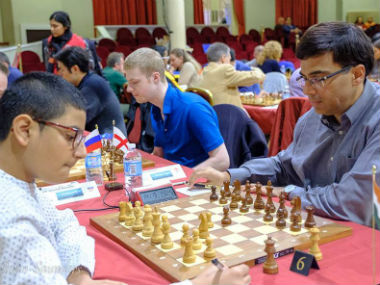 Viswanathan Anand narrowly escaped defeat against Raunak Sadhwani. Image Courtesy: John Saunders[/caption] The nine-round Swiss league will be played in the Royal hall of Villa Marina in Douglas. The rate of play will be 100 minutes for 40 moves, followed by 50 minutes for 20 moves, then 15 minutes for the remaining moves, with 30 seconds added per move from the start. On the line is a hefty £133,000 prize purse, of which the title winner’s share will be £50,000. One of the biggest changes in this year’s edition is that the organisers have scrapped the randomised pairings for the opening round and have gone back to the traditional Swiss manager pairings. This, of course, meant that, unlike last year, the second and the third seeds would not face each other in the opening round itself. But the inaugural round did witness some very interesting matchups. On the sixth board, Grandmaster (GM) Viswanathan Anand was to face his 13-year-old compatriot, International Master (IM) Raunak Sadhwani. Raunak has played fearlessly against some very strong Grandmasters in the past. In this game, too, Sadhwani played ruthlessly to reach a winning position in the middle game. But he was playing one of his idols after all and nerves did play a role in the game. Anand had opted for the 4…g6 variation of the Ruy Lopez, something he has been seen using quite frequently since the Batumi Olympiad. Sadhwani looked well prepared. Exchanging a couple of minor pieces, he got out of the opening with a pleasant position. On his 18th move, Anand dived into danger with his queen and grabbed a pawn, but soon began to repent his decision. “I think, his position was just very pleasant out of the opening. I didn’t like it, so I went for this suicidal 18…Qg4. But I simply missed that 20.Ra7 is so strong,” Anand told in his post-game interview. Sadhwani, however, failed to find the most critical continuation and allowed his opponent to slowly make his way out of the dungeon. Equality had been restored by the 30th move and eventually Anand managed to pull out a win. Anand also pointed out after the game that Sadhwani is “ridiculously underrated” and said that it was an unpleasant feeling for him to see the pairings. “Okay, now I am relieved to have won,” Anand said with a sigh, in conclusion. One board above Anand, another Indian International Master, CRG Krishna played some excellent chess against Wesley So to hold the American number two to a draw. So, who had the white pieces in the game, went all out for a victory grabbing space on both wings of the board quite early in the game. By the 20th move, he had already given up a pawn and was looking to attack down the ‘h’ file. Krishna simply took the pawn and blockaded the file in question with his bishop. Wesley had taken some risk and, consequently, had ended up in a worse position. Around the 35th move, Krishna was merely inches away from slaying one of the top Grandmasters of the world, but So generated enough complications in the second time control to wriggle out with a draw. Vladimir Kramnik also had to walk a tightrope in his game against GM Sundarajam Kidambi. Kidambi got a decent edge out of an English opening and pressed on the queenside with the white pieces. While he had the better position for the most part, some misplay in the endgame left Kidambi in an equal position by the time the first time control was reached. Kramnik then began to press for an edge but once the queens were exchanged, an endgame with opposite coloured bishops was reached. Kramnik had an extra pawn here. He tried pushing for a win for about 20 more moves, but had to concede half a point in the end. On the 29th board, IM Eesha Karavade lost the shortest game of the round to the 17-year-old American GM Jeffery Xiong. With the white pieces, Xiong generated a monstrous attack on the black king after Karavade made some errors in the opening. On her 16th turn, Karavade made the decisive error that allowed Xiong a mating combination. Averting checkmate required Karavade to suffer a ruinous loss of material. She, therefore, decided to throw in the towel after 21 moves. Arjun Kalyan and Harshit Raja also held much higher rated opponents to draws. While Arjun split the point Vietnamese number one, Le Quang Liem, Harshit signed the truce against GM Richard Rapport of Hungary. The second round will see some more clashes with steep rating differences between players: GM Abhimanyu Puranik will take on Maxime Vachier Lagrave; Nihal Sarin will face Wang Hao; and Viswanathan Anand will play American GM, Robert Hess. Follow all the games of Isle of Man Masters below Standings (Top 20)
