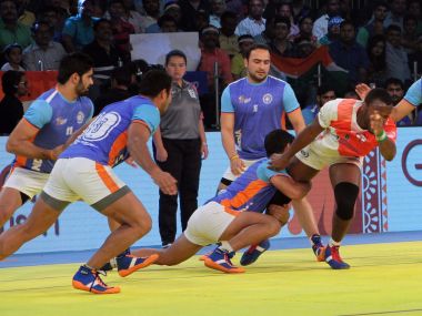 India were flawless in their 69-18 win over England. Twitter@StarSports[/caption] The crowd at the TransStadia arena was in for a treat as the home team put on a spectacular show. After suffering a shocking defeat in their opening match against South Korea, India bounced back in style and finished the group matches with a whopping score difference of 174. England, on the other hand, can take a lot of heart from their performances as they finished fourth in Group B with 10 points. On Tuesday, England made a bright start as captain Someshwar Kalia scored two points in the first minute to lead 2-1. Sandeep Narwal scored with a super raid in the third minute as India overtook the visitors 5-2. Thakur scored with a two-point raid in the fifth minute as India extended the lead to 8-3 and reduced England to just two men. India inflicted the first all out of the match in the sixth minute to lead 12-3. Narwal scored his first points in the seventh minute to give India 14-3 lead. Keshav Gupta scored with a two-point read in the 10th minute as England trailed 5-17. Sandeep Narwal was in great raiding form as he scored six points to help India inflict the second all out in the 13th minute and get a lead of 24-5. England’s defence let them down as they failed to score a single point in the first 15 minutes. India inflicted another all out in the 16th minute to take a commanding 33-5 lead. Such was India’s dominance that they went on a 20-0 run in eight minutes to lead 37-5 after 18 minutes. Pardeep attained a super 10 in the first half whereas Surjeet got a high five as India inflicted the fourth all out in the 20th minute to lead 45-6 at the end of the first half. Coming back, India brought on five substitutes in the second half, including Rahul Chaudhari, to make use of their squad. Nitin Tomar scored two points in the 23rd minute as India led 49-7. England were still looking for their first tackle point and their star raider Tope Adewalure struggled to get raid points. India went on to inflict another all out in the 28th minute to take their lead to 57-8 before England’s Adewalure scored two raid points consecutively to become the first man to score 50 points in the ongoing World Cup. With less than five minutes to go, and India leading 64-14, Rahul scored his third point of the match. India cruised in the last few minutes as Thakur attained a super 10 in the 39th minute to give India a handsome 69-18 win. Kenya record big win against USA to stay alive Kenya kept their hopes alive of a semi-final berth after registering a thumping 74-19 win over the US in their last league tie of the Kabaddi World Cup. Desperately in need of a win, Kenya finally pressed the acceleration button to push Thailand out and occupy the second spot in Group B. Top-placed Iran are already in the semi-finals while Kenya will have to wait for the Japan (fourth) vs Thailand (third) match on Wednesday to know their fate. On Tuesday, Kenya exhibited great determination to outplay minnows US as they went into the break with a 38-8 lead. Three Kenyan defenders achieved a high five whereas captain David Mosambayi top-scored with 12 points. On the other hand, the US defence could manage only five points as the newbies committed too many errors, to end their campaign without a win. The US started with a 2-1 lead, scoring a raid and tackle point whereas David Mosambayi got a tackle point for Kenya in the first two minutes. But their joy was shortlived as Kenya’s David Obilo scored two tackle points while Mosambayi added two raid points to take the lead to 5-4 after five minutes. Kenya, immediately inflicted the first all out of the match in the seventh minute to lead 10-4. Kenya scored five more points in three minutes to lead 15-4 after 10 minutes. Mosambayi scored with a two-point raid as Kenya inflicted the second all out to lead 20-4 in the 12th minute. In the next minute, Ben Marcelus helped the US add two more points as they trailed 6-21. Phelix Ospina then scored with a super raid in the 15th minute as Kenya took their lead to 26-6. In response, the US suffered the third all out in the next minute as Kenya’s lead soared to 31-7. Kenya went into the break with a 30-point lead after David Mosambayi attained a super 10 and contributed 10 points whereas Ospina scored seven. Coming from the break, Kenya began with a bang and inflicted the fourth all out in the 22nd minute to take their lead to 42-8 before further taking it to 48-10 by the 25th minute. A minute later the US suffered another all out as Kenya took full advantage of the US’ defensive errors. Kenya continued on their dominant form to take the lead to 56-12 after 30 minutes. In the 33rd minute, Dillyon Banks came up with a super raid to take three points for Kenya. Kenya then forced two super tackles in quick succession to lead 64-18 after 35 minutes before forcing another all out in the last minute to take it to 74-19.