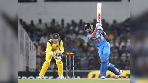 Nagpur: India pulled off a sensational six-wicket victory over Australia in the do-or-die sixth cricket one-dayer, riding on Virat Kohli’s brutal unbeaten 115 and Shikhar Dhawan’s blistering century to level the seven-match series 2-2 here today. Chasing a mammoth 351, the Indians gave ample display of their batting firepower on a belter of a track at the VCA Stadium at Jamtha to overhaul the target with three balls to spare in what turned out to be a thrilling floodlit contest which went down the wire. [caption id=“attachment_1202989” align=“alignleft” width=“380”]  Virat Kohli scored his 11th ODI hundred in chases. PTI[/caption] The incredible run chase brought back memories of India’s awesome victory in Jaipur on October 16 when they overhauled a stiff target of 360, achieving the second highest successful run chase ever in ODI history. Dhawan (100), Rohit Sharma (79) and Kohli – who hit the third fastest ODI hundred by an Indian from just 61 balls, were the main architects of India’s victory in the high-scoring tussle which has restored the balance of the series after the Ranchi and Cuttack ODIs were washed out. Earlier, George Bailey (156) and Shane Watson (102) smashed scintillating centuries as Australia put the listless Indian bowling attack to the sword to post an imposing 350 for six after being in to bat. India replied in stunning fashion with Dhawan hitting his fourth ODI ton in his 24th match while Kohli struck his 17th century in his 118th match. Dhawan faced 102 balls in his innings and hit 11 boundaries while Kohli’s unbeaten knock came from just 66 balls with the help of 18 fours and a six. Captain Mahendra Singh Dhoni (25 not out) hit the winning runs – a two – as India reached 351 for four to bring the capacity crowd to raptures and the home team players hugging each other at the dressing room. With the scores locked 2-2, the seventh ODI in Bangalore on Saturday will serve as the summit showdown of the series which has already seen a phenomenal 2565 runs scored so far (excluding the 295 scored by Australia in the abandoned fourth match at Ranchi). India stuttered a bit towards the end as Suresh Raina (16) and struggling Yuvraj Singh (0) were out in the same over – 43rd – but Kohli, who had hit the fastest-ever 100 off just 52 balls by an Indian in Jaipur and an equally unruffled Dhoni saw them home with an unbroken partnership of 61 for the fifth wicket. The game looked on a knife’s edge even after the great start given by Dhawan and Rohit – who shared 178 runs from 29.3 overs for the opening wicket – but Kohli tore into the visitors’ bowling attack to swing the game in India’s favour. Dhawan was lucky to be let off when on 19 off James Faulkner at fly-gully by Glenn Maxwell and then survived a difficult chance after reaching his 50. In between these two escapes and earlier too, he got his runs mainly by using his bottom hand to hit square and behind the wicket on both sides and reached his half century with a run-a-ball effort. Rohit, who made an unbeaten 141 in the earlier successful run chase at Jaipur, started off cautiously against the medium pacers and then was severe on Maxwell whom he hit for two sixes in the 29th over and then fell while trying to repeat the feat in the next over. When Rohit exited, India needed 173 from 183 balls and Kohli started off positively by striking Xavier Doherty for a six and two fours in 33rd over. Dhawan and Kohli brought the hosts 117 runs adrift of the target in the last 96 balls with a stand of 56 when the left handed opener departed off the left-arm pacer James Faulker. Kohli, India’s most consistent batsman in the series, and Raina got involved in a partnership of 54 to bring the home team close to victory. Mitchell Johnson, treated harshly by Kohli in his previous over, came back strongly to dismiss left-handers Raina and Yuvraj in the 43rd over at the same total of 290 to bring his side back into the game. Kohli and Dhoni, however, ensured that India got past the finish line though at one time during their partnership, the home side needed 48 off 30 balls and then 35 off the last 18. Earlier, Watson struck 13 fours and three sixes in making 102 off 94 balls while the in-form Bailey was equally impressive in scoring a career-best 156, his second ODI ton, in 115 balls as Australia scored an imposing 350 for six. These two batsmen also compiled the second-highest third wicket stand of 168 in ODIs against India to help the visitors record their fourth 300-plus total in the series. The home team started off well by sending back openers Phil Hughes (13) and Aaron Finch (20) before the score had crossed 50 but were pushed into the backseat as Watson and Bailey launched a superb counter-attack. The duo simply tore apart the clueless Indian bowling attack that fielded three frontline spinners for the first time in the seven-match series after the hosts decided to go in with Amit Mishra to partner R Ashwin and Ravindra Jadeja. Later, after the dismissal of Watson and Glen Maxwell (9), Adam Voges (44 not out) helped his captain add another 120 runs in only 80 balls for the fifth wicket to complete India’s misery on a good batting track. While the 32-year-old Watson was all power, Bailey, who has been the team’s most consistent batsman in the series, once again dominated the home team attack to notch up his fourth 50-plus score in five innings. India had the visitors under check in the first 20 overs by restricting Australia to 83/2 but the middle overs were totally dominated by Watson and Bailey who compiled the second-best-ever third wicket stand for their country against the hosts. The 168-run partnership, that came off just 142 balls, was only the second-highest after Ricky Ponting and Damien Martyn’s unfinished 234 in the 2003 World Cup final at Johannesburg and the eighth 150-plus stand for all wickets against India. PTI
