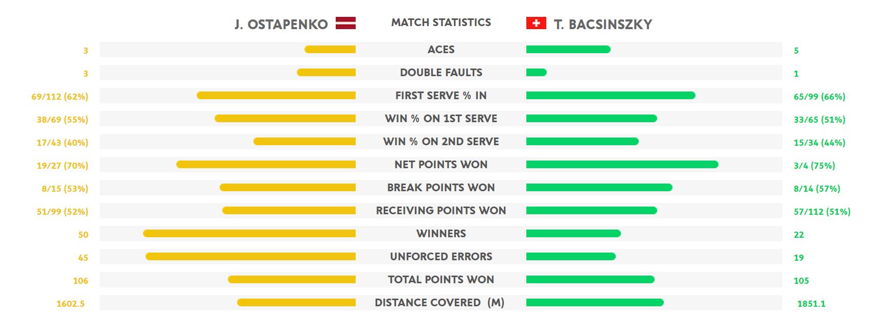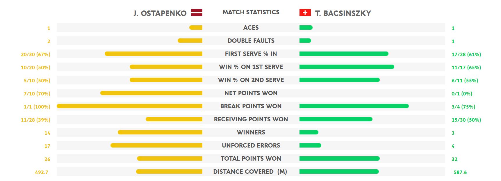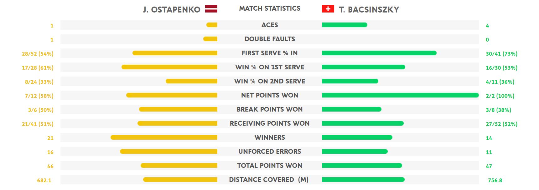 Ostapenko wins the next point to make it 30-30 but then she loses a long rally at the net after Bacsinszky lobs her perfectly. Break point for the Swiss player.
