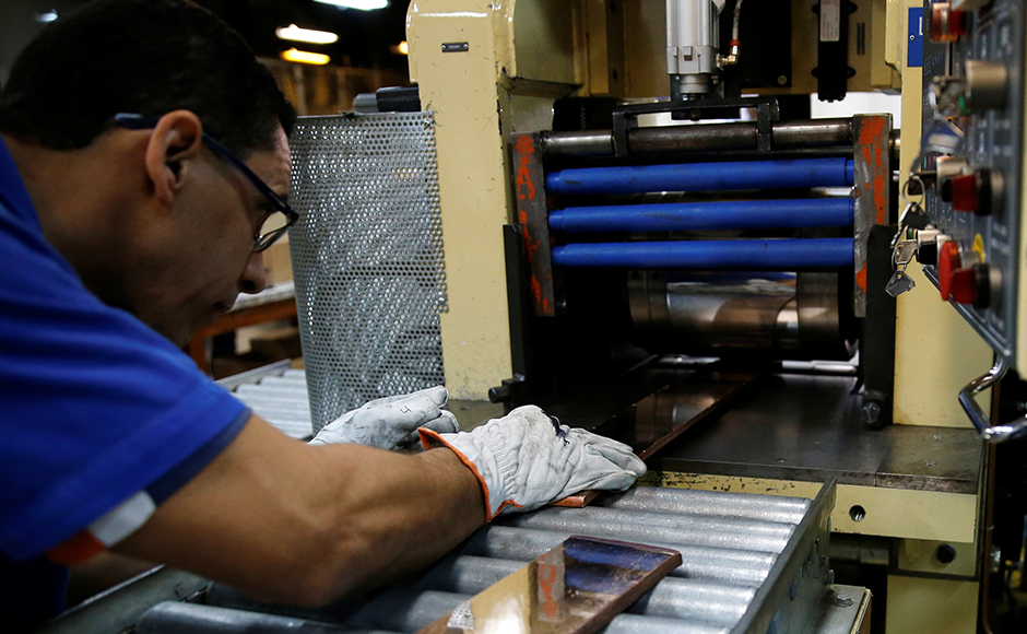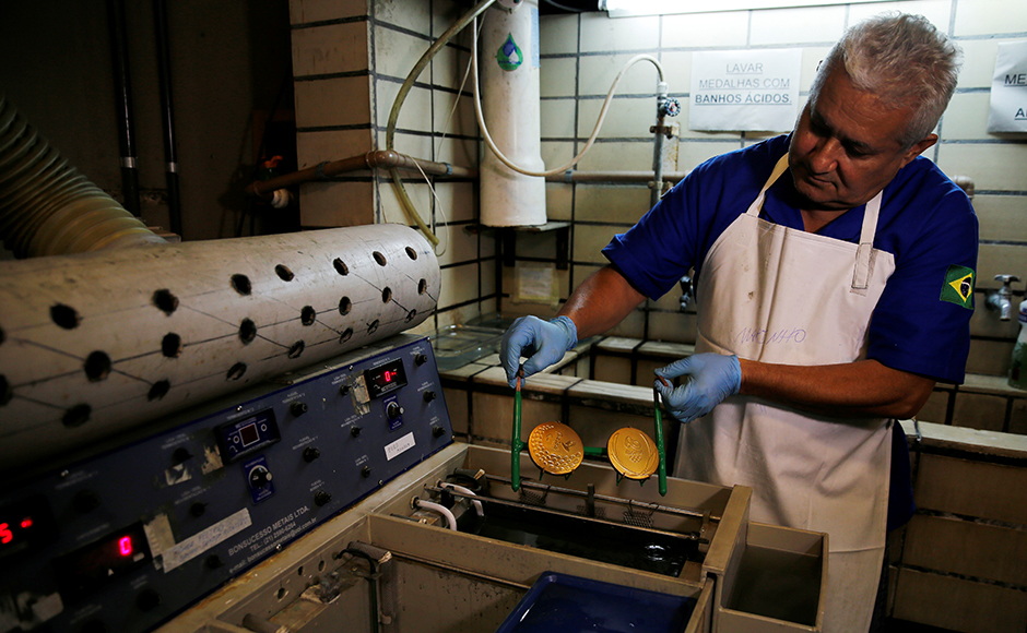 A worker handles plates while preparing the medals. Nike, the winged goddess of victory in Ancient Greece, is minted on one side below the five Olympic rings, while the discipline for which the medal has been won is engraved along its edge. The other side bears the Rio 2016 logo. (REUTERS/Sergio Moraes)