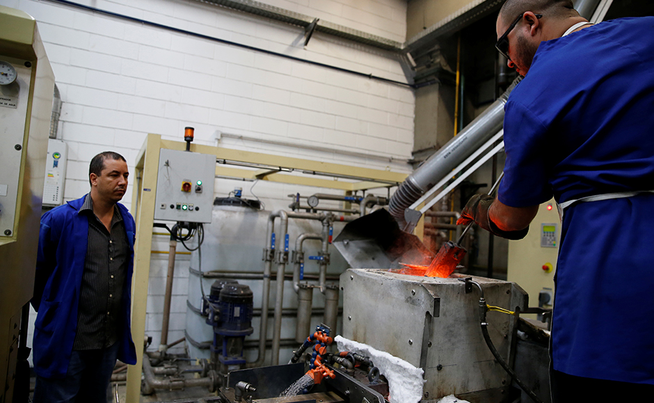 A worker pours molten metal into a mold. “It’s a sense of great satisfaction that our work will be worn on the chests of athletes who have given everything to win,” said craftsman Nelson Neto Carneiro, who has worked at the mint for over 40 years. (REUTERS/Sergio Moraes)