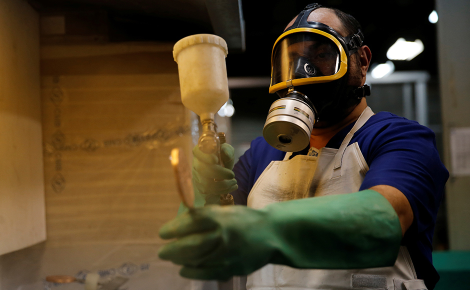 A worker varnishes an Olympic medal after it has been extracted it from its molds. (REUTERS/Sergio Moraes)