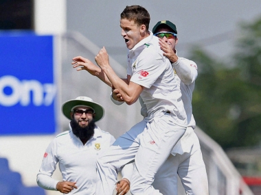 South African bowler Morne Morkel celebrates the wicket of Indian Captain Virat Kohli during the 3rd test match in Nagpur on Wednesday. PTI[/caption] In-form opener Murali Vijay top scored with an innings of 40, while wicketkeeper batsman Wriddhiman Saha (32) and Ravindra Jadeja (34) revived the tottering innings briefly. Cheteshwar Pujara (21) and skipper Virat Kohli (22) got decent starts only to throw them away. For South Africa the early damage was done by lanky pacer Morkel, who grabbed a superb 3 for 35 in three spells before limping off the field after bowling the first ball of his fourth. His wicket-taking spells, the second and third, read 4-2-8-1 and 4-2-8-2. Off spinner Simon Harmer, dropped from the team in the drawn Bengaluru Test after playing in the series opener at Mohali, supported him with a fine haul of 4 for 78, by getting good purchase off the turning track. Young fast bowler Kagiso Rabada and spinners Elgar and Tahir accounted for the other wickets. There were only two significant partnerships in the Indian innings –- 50 between openers Vijay and Dhawan and 48 between Saha and Jadeja. The Indian innings got off to a fine start when Vijay, who struck a six and 3 fours in his 84-ball knock, and Dhawan (12) put on their second successive half century stand of the series. An opening stand on 50 runs set the innings in the morning before losing Vijay and Dhawan in the second hour to adjourn to the interval at 85 for 2. Dhawan, denied strike for long, was lured out by Elgar soon after the 50 was raised in 13.4 overs and spooned a drive back to the left arm slow bowler who accepted a return catch to his right. The left hander’s 12 came off 23 balls and 68 minutes and was his third low score in the series after bagging a pair in the opening Test at Mohali followed by an unbeaten 45 in the rained out second game at Bengaluru. South Africa, then, hit back strongly through Morkel in the first hour post lunch. The loss of both the batsmen in the second hour before lunch followed by a dramatic post-lunch middle-order collapse undid the initial good work. The batsmen dismissed, mostly to poor shots, were Pujara (21), skipper Virat Kohli (22), Ajinkya Rahane (13) and Rohit Sharma, who did not play in the first two Tests. In the space of 15 overs after lunch India lost four wickets for the addition of only 31 runs after being 95 for two – Morkel and Harmer doing the damage. Morkel, who got rid of Vijay in the first session, added the wickets of Kohli and Rahane to his kitty in a fiery third spell of 4-2-8-2. Pujara was taken out by off spinner Simon Harmer who trapped him leg before and later got rid of a struggling Rohit Sharama (2) as India slumped to 125 for 6 from 50 for no loss in 32.2 overs on either side of lunch and then made a recovery of sorts. Wicketkeeper Saha (32) and Jadeja (34) then repaired the damage with a stand of 48 in 106 balls. Jadeja played some attacking shots against the spinners before he threw away his wicket by trying a wild heave off Rabada after a brisk 73-minute knock that contained 6 fours. But South Africa suffered a major blow when their main pace bowler in the game, Morkel, limped off the field after bowling the first ball of his fourth spell. India’s last four wickets added 90 runs to pull them out of a deep hole. When South Africa replied, Ravichandran Ashwin again opened the bowling and sent back left hander van Zyl with a sharply turning ball that caught the edge and was pouched by slip fielder Ajinkya Rahane. Tahir, who narrowly escaped a stumping appeal off Ashwin, was then bowled comprehensively by Jadeja as he played back to a ball that straightened after pitching and hit the off stump. A tantalising day’s play is on the cards on the morrow. PTI