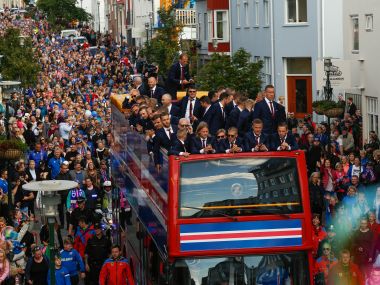 Reykjavik: Iceland’s footballers received a heroes welcome on returning home on Monday following their astonishing run to the Euro 2016 quarter-finals in France. Their plane flew low over the capital Reykjavik before landing at Keflavik airport where the local fire services gave them a fire hose guard of honour with shooting water creating a rainbow. Striker Kolbeinn Sigthorsson, who scored a consolation goal in the crushing 5-2 defeat to the hosts at the Stade de France on Sunday said he was happy to be home. [caption id=“attachment_2873954” align=“alignleft” width=“380”]