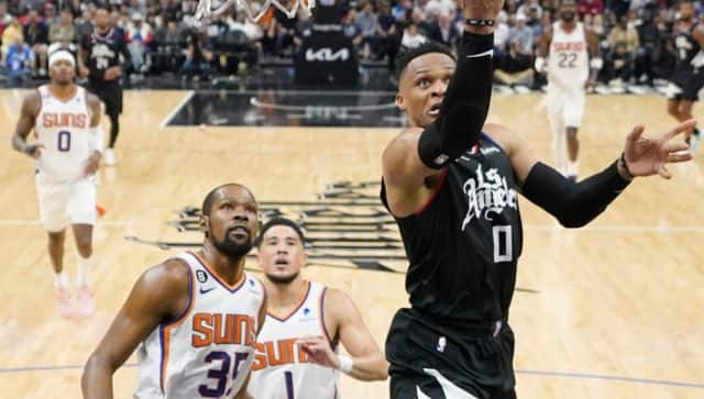 Los Angeles Clippers guard Russell Westbrook,shoots as Phoenix Suns forward Kevin Durant and guard Devin Booker defend during the second half in Game 4. AP[/caption] Kevin Durant scored 31 points, Devin Booker added 30 and Phoenix defeated Los Angeles without Kawhi Leonard to take a commanding 3-1 lead in the first-round playoff series. The Clippers, who lost Game 3 by five points, again made a strong run with Leonard watching from the bench. He has missed two straight games with a sprained right knee. They’re also without Paul George, who hasn’t played since 21 March because of the same injury as Leonard. Russell Westbrook carried the Clippers in the fourth quarter. He had 14 points, including nine in a row when they twice pulled within two points. Westbrook finished with a game-high 37 points. Norman Powell added 14 points and Terance Mann had 13 off the bench. Game 5 is Tuesday in Phoenix. LAKERS 111, GRIZZLIES 101 [caption id=“attachment_12494092” align=“alignnone” width=“640”]