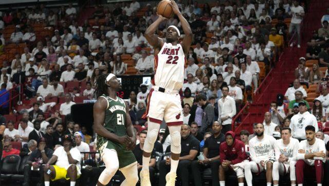 Miami Heat forward Jimmy Butler shoots over Milwaukee Bucks guard Jrue Holiday during the first half of Game 3. AP[/caption] Jimmy Butler scored 30 points before leaving with a sore glute following a hard fall, and eighth-seeded Miami beat top-seeded Milwaukee for a 2-1 lead in their Eastern Conference first-round playoff series. Duncan Robinson scored 20 points on his 29th birthday for Miami, while Kyle Lowry scored 15 for the Heat. The Bucks were without Giannis Antetokounmpo for a second consecutive game because of a bruised lower back. Khris Middleton scored 23 points, Jrue Holiday added 19 and Grayson Allen scored 14 for Milwaukee. Game 4 is in Miami on Monday night. With the win, the Heat are halfway to what would be a stunner — a No 8 seed over a No 1 seed, something that’s happened only five times since the NBA went to the 16-team playoff format in 1984. Read all the