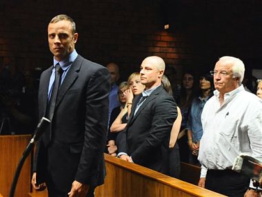 Nel accused Pistorius, the one-time star of disabled sport, of tailoring evidence. AP[/caption] Nel accused Pistorius, the one-time star of disabled sport, of tailoring evidence and concocting the version to cover up that he killed Steenkamp intentionally after a late night fight. Pistorius steered away from a direct response to the prosecutor’s invitation to take the blame for Steenkamp’s killing, saying only that he opened fire because he believed his life was under threat. That remark drew barbed follow-up questions from Nel. “We should blame somebody … Should we blame Reeva?” asked Nel, who has harshly criticized Pistorius as someone who is unwilling to take responsibility for his actions. “No, my lady,” Pistorius replied, addressing Judge Thokozile Masipa in line with court custom. “She never told you she was going to the toilet,” Nel said. Then he asked: “Should we blame the government?” When Pistorius responded with another reference to a perceived attacker in his toilet, Nel asked: “Who should we blame for the Black Talon rounds that ripped through her body?” He abandoned his line of questioning soon after the judge questioned whether he was asking the same thing in a different way. Nel said the court “will” find that Pistorius, 27, is lying and intentionally killed the 29-year-old model and rising reality TV star. That drew an objection from defense lawyer Barry Roux. In the adjournment after his cross-examination, Pistorius rubbed his eyes and briefly sank his head onto the shoulder of a man who had been sitting with his family. He took a tissue from his sister Aimee, who squeezed his arm reassuringly. Shortly afterward, he listened attentively as Roux spoke to him in a low voice. Nel asserted that the couple fought during the night of the shooting and Steenkamp wanted to leave, and then fled to the bathroom screaming before Pistorius shot her through the door with his 9 mm pistol. Pistorius said he never heard Steenkamp scream, or say anything in the minutes before he shot her. The prosecutor even charged that Pistorius fired the four shots from about three meters (yards) away from Steenkamp as he was talking and arguing with Steenkamp, and changed his aim with later shots to ensure that he hit her as she fell back. Nel’s unrelenting questioning and accusations provoked many denials by Pistorius and caused the athlete to break down in sobs on numerous occasions. “Unfortunately I have to put it to you that it’s getting more and more improbable,” Nel said to Pistorius of his story. Pistorius struggled at times to explain alleged inconsistencies during his testimony and the Paralympic champion faces 25 years to life in prison if convicted of premeditated murder. He remained in the witness box while Roux asked him a series of follow-up questions after the recess, with his lawyer attempting to reinforce the account of a mistaken killing. Roux asked Pistorius to describe his thoughts and emotions in the seconds before he shot at the door. “I was terrified. I feared for my life. I was just scared,” Pistorius said. “I was thinking about what could happen to me, to Reeva. I was just extremely fearful.” During cross-examination, Pistorius gave a sometimes muddled account of the shooting, saying he feared for his life but also didn’t intentionally shoot at anyone, prompting Nel to query if his defense was self-defense or “involuntary action.” Pistorius also told Roux he didn’t consciously pull the trigger on his gun and said it happened “before I could think.” AP