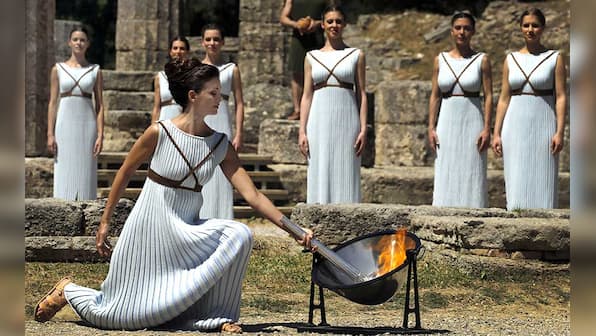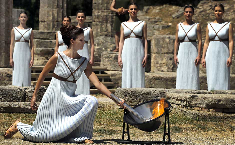 [caption id=“attachment_2741660” align=“alignnone” width=“940”]  Greek actress Katerina Lehou lights a torch from the sun’s rays reflected in a parabolic mirror.