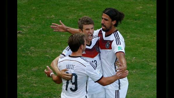 Germany’s Thomas Mueller celebrates with Mario Goetze and Sami Khedira (R) after scoring a goal during the 2014 World Cup Group G football match between Germany and Portugal at the Fonte Nova arena in Salvador. Reuters