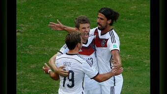 Germany's Thomas Mueller celebrates with Mario Goetze and Sami Khedira (R) after scoring a goal during the 2014 World Cup Group G football match between Germany and Portugal at the Fonte Nova arena in Salvador. Reuters